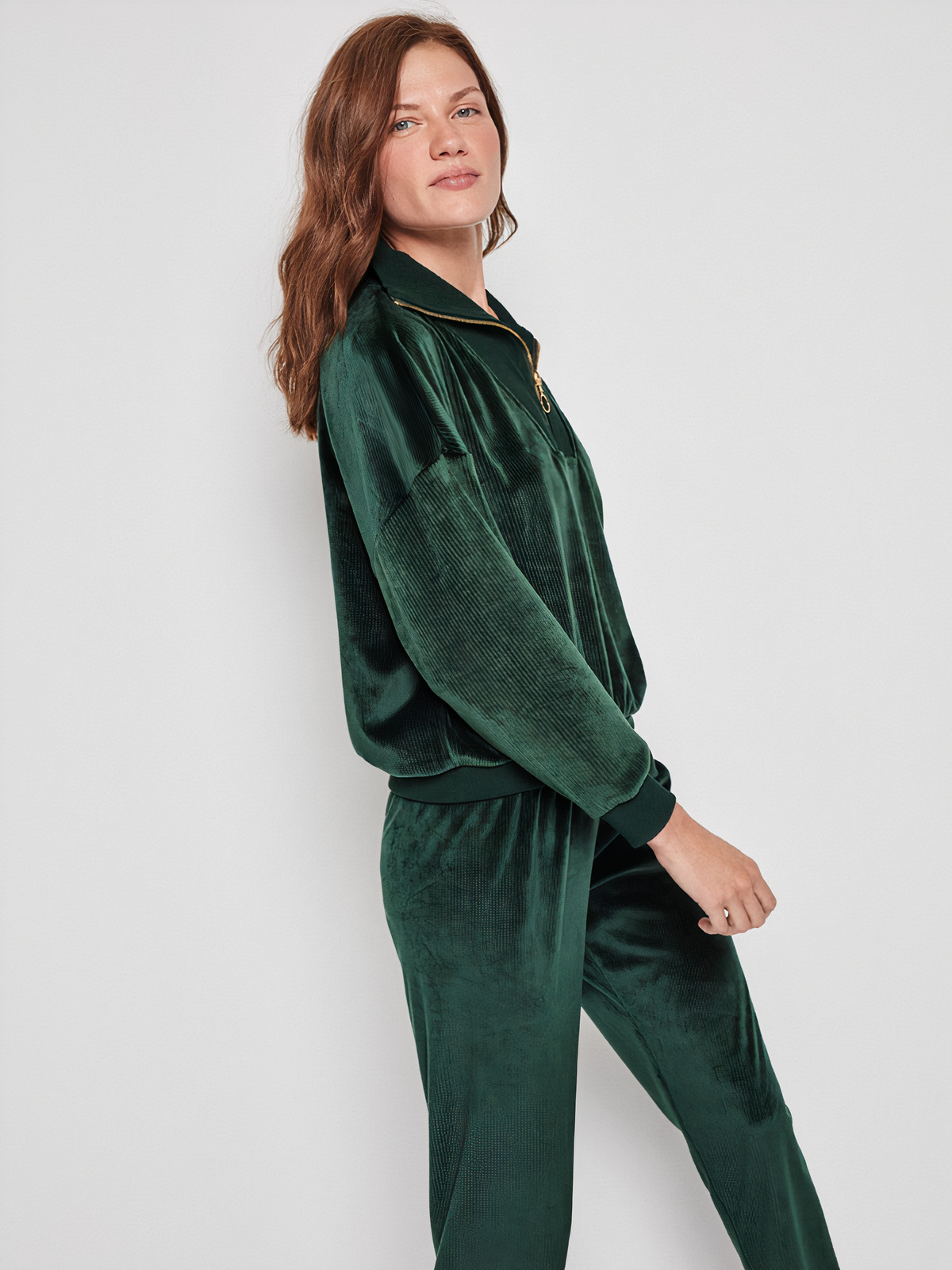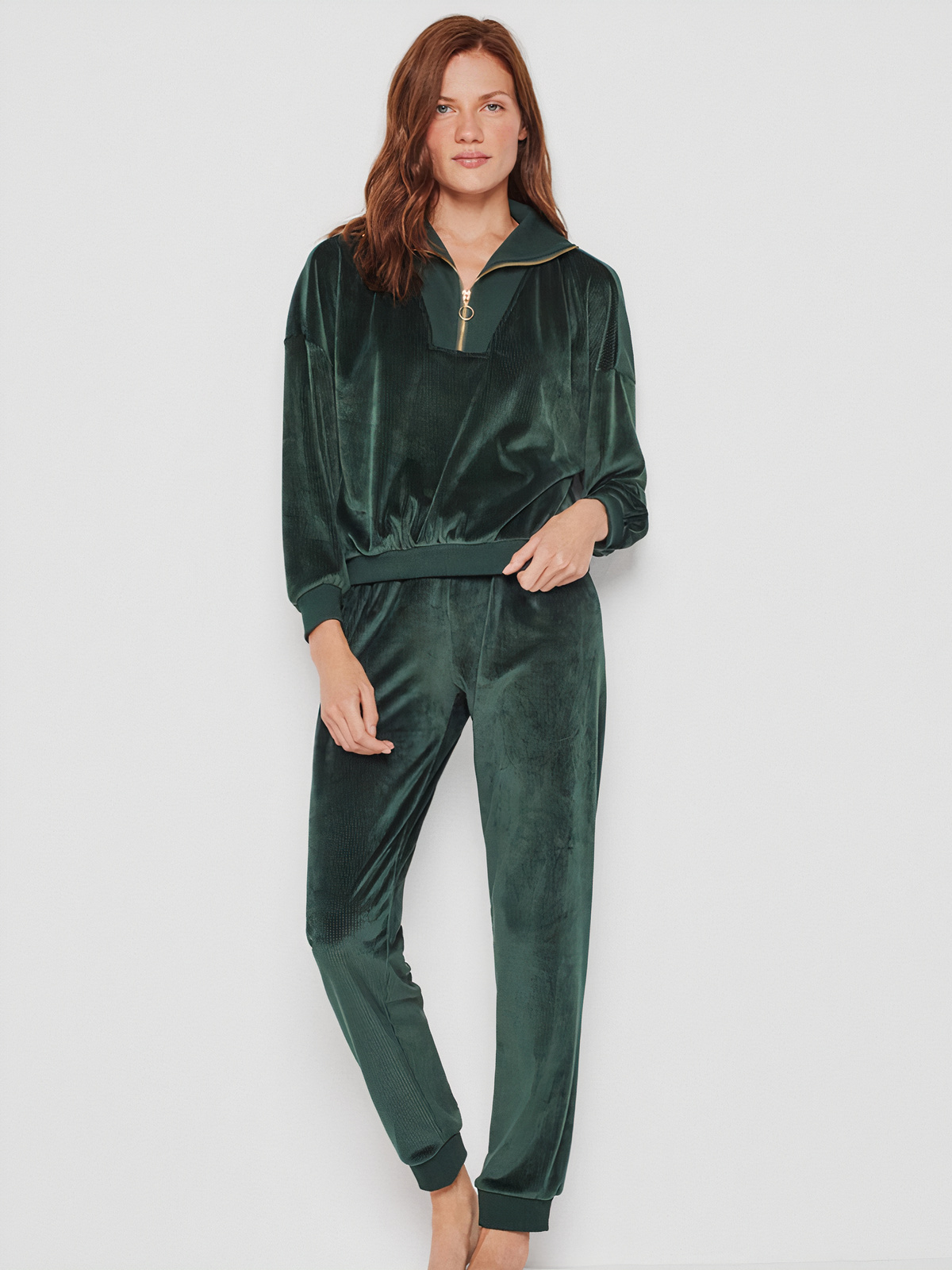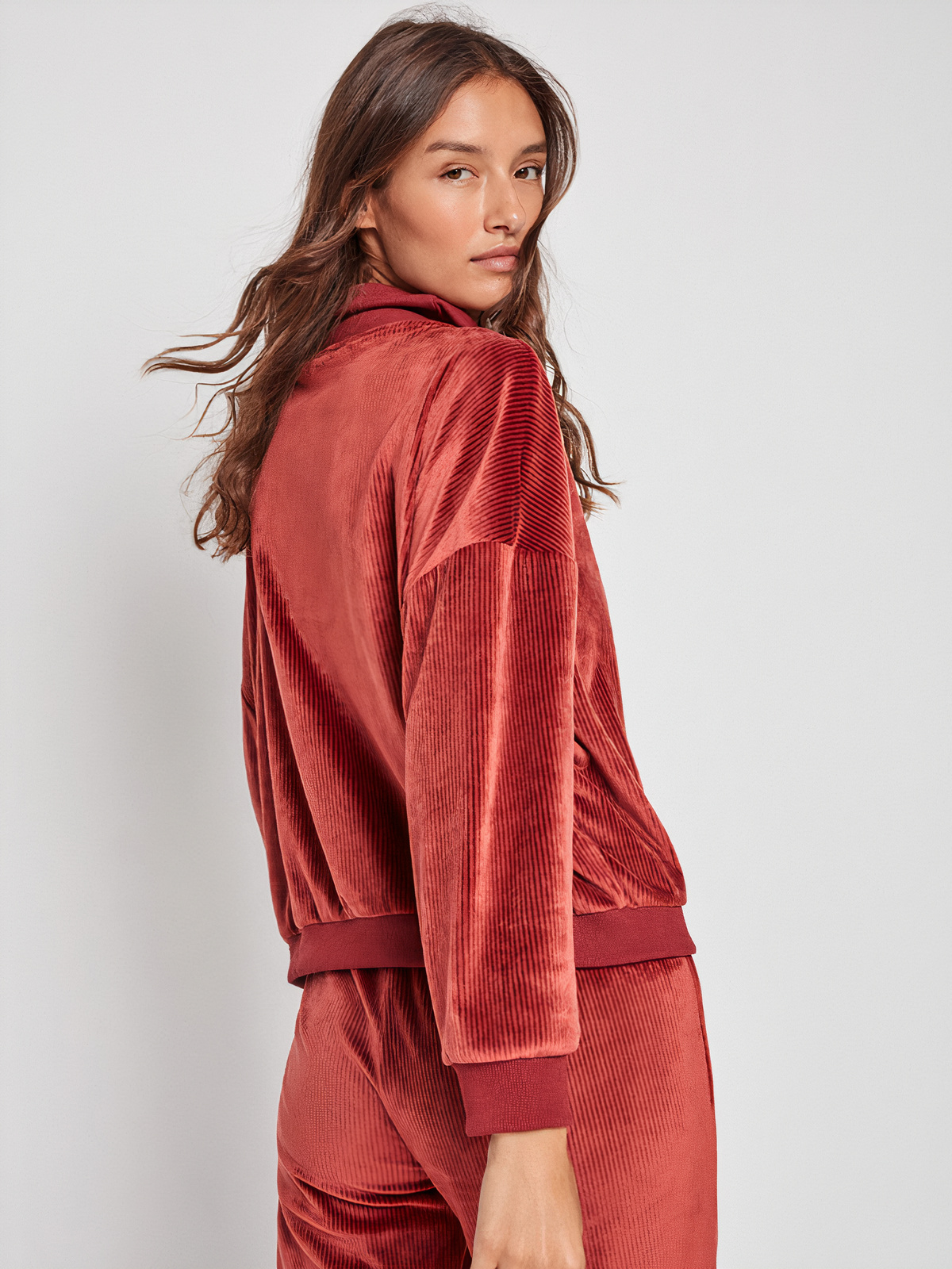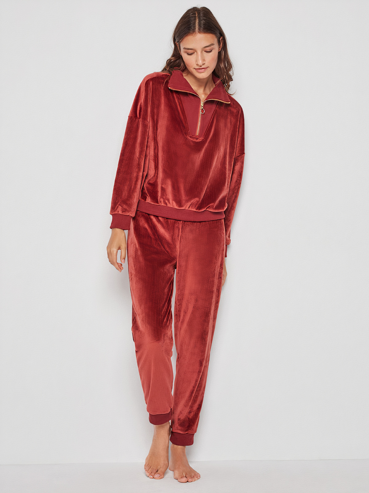 Fato de Treino em veludo e tecido canelado. Jersey com fecho e gola. Calças compridas ajustáveis na cintura com elástico.
