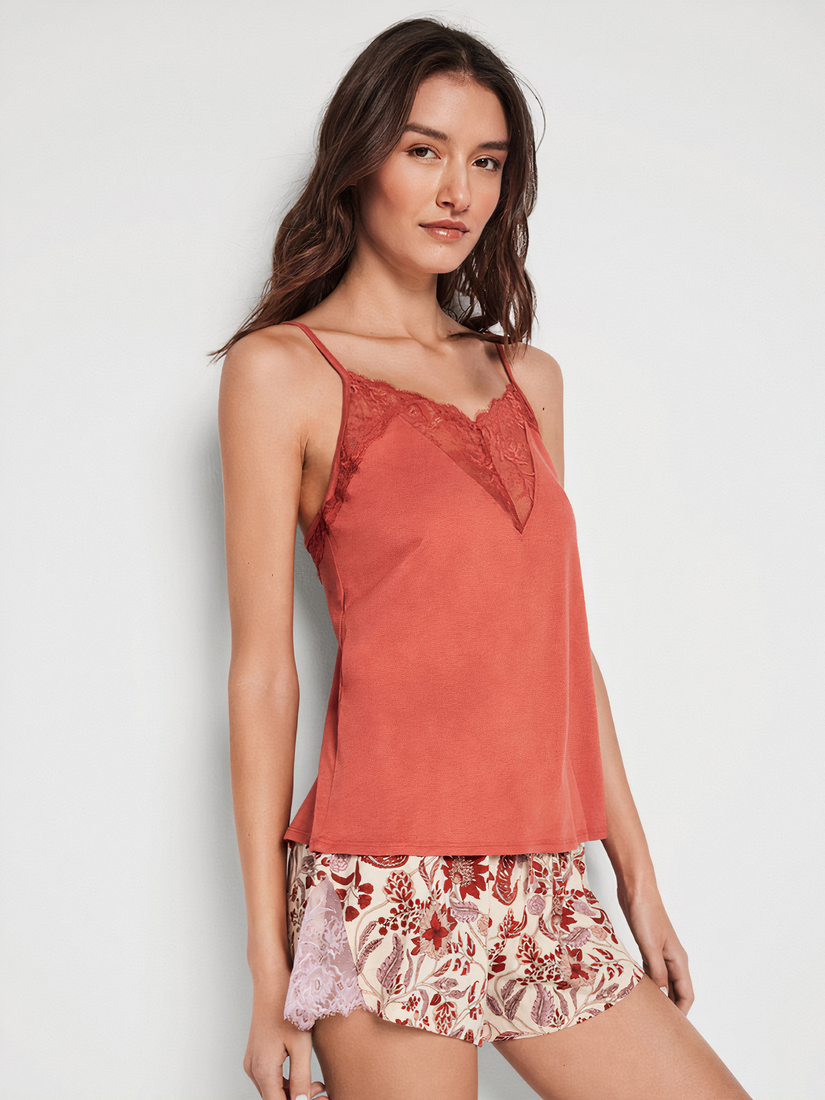 Pijama GISELA curto com camisola de alças e tecido de renda no decote. Calções com estampado floral ajustáveis na cintura.